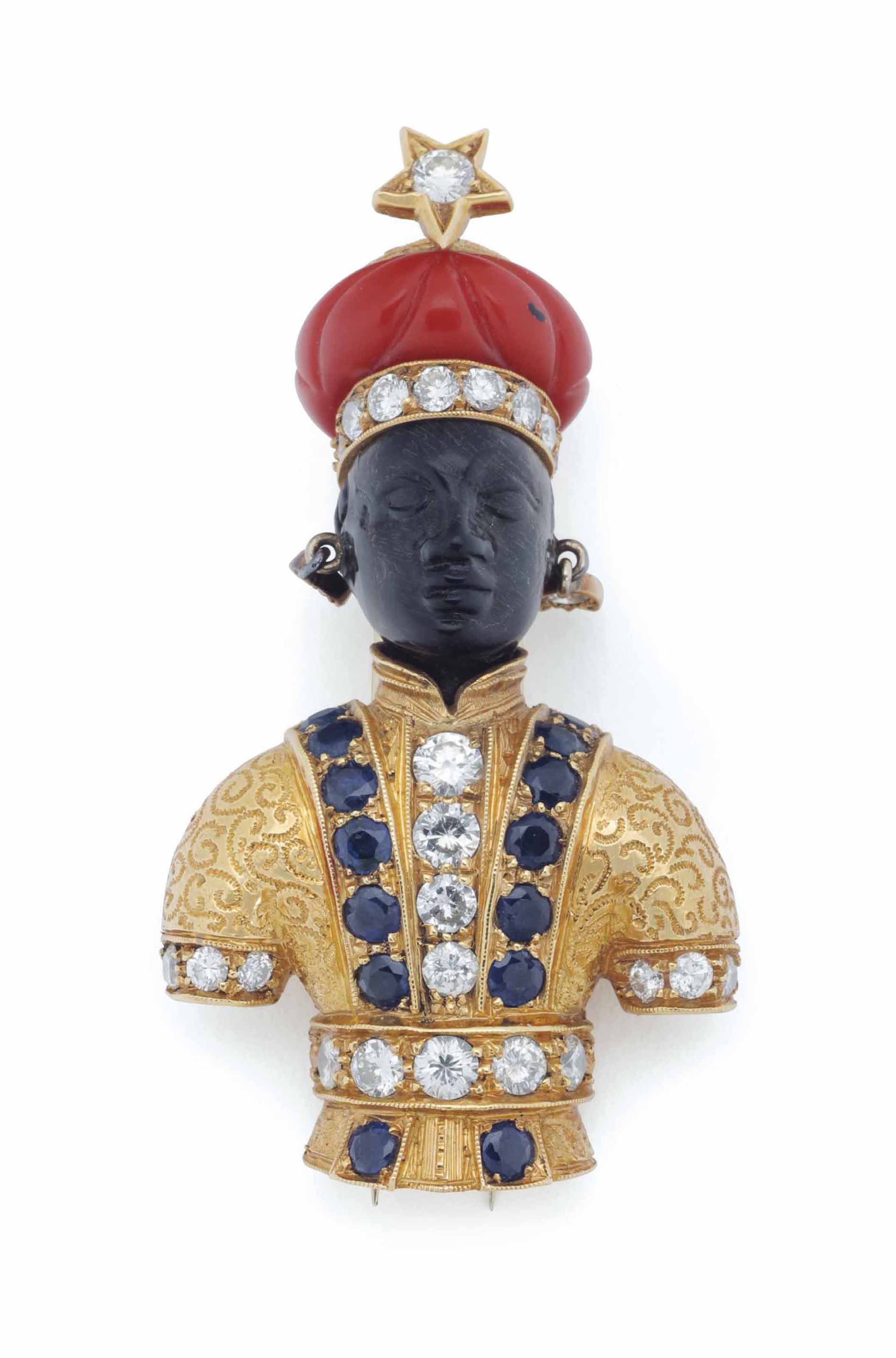 A diamond, sapphire, coral and gold figural brooch, Venezia c 1980. Stamped ‘750’, signed ‘G. Nardi’ 2 1/8 in. (5.4 cm.) high. Sold for USD 6,875 at Christie’s