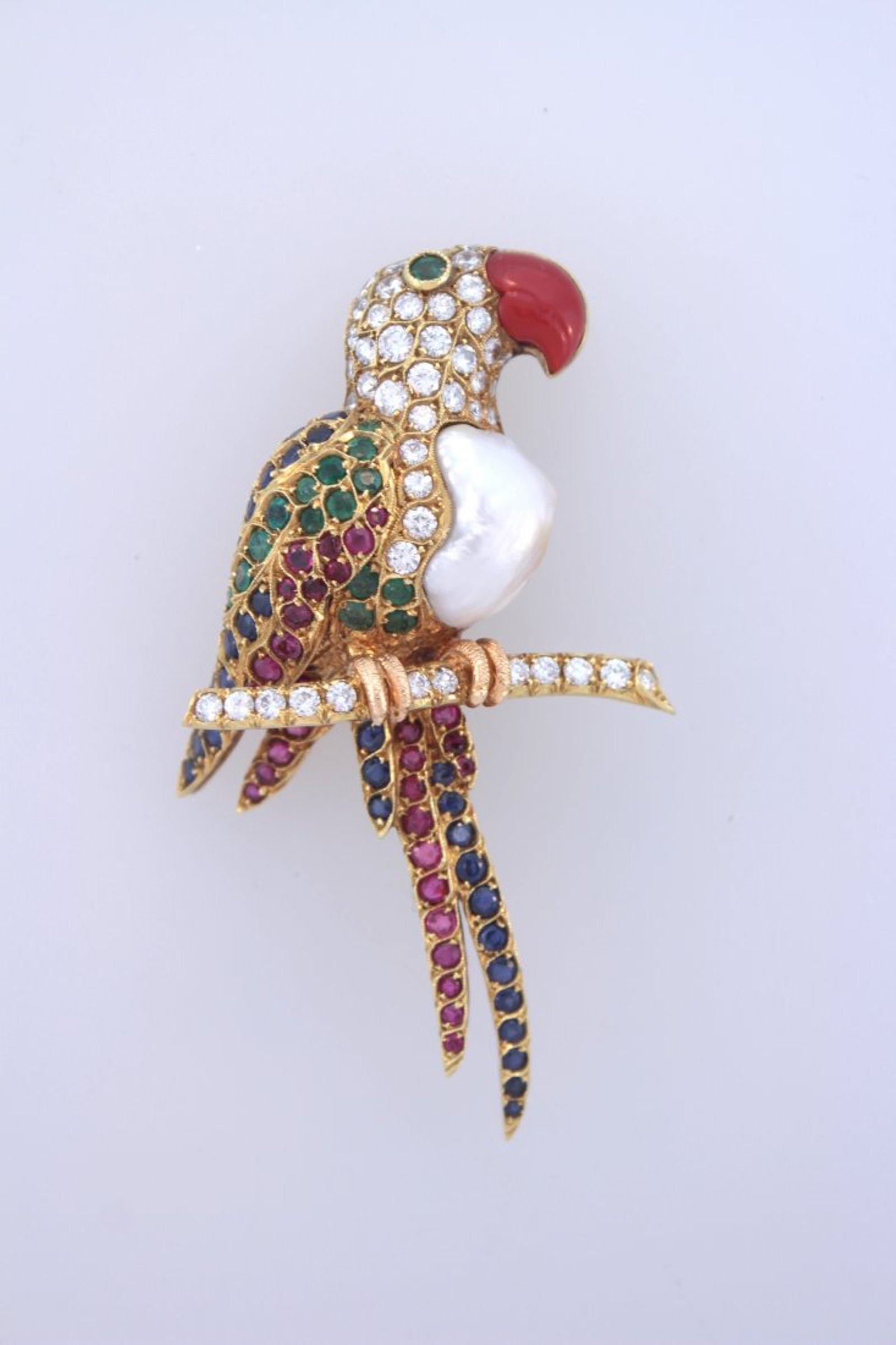 18K Gold Mounted Brooch in the form of a Macaw, Italian c.1950, with baroque pearl breast and multi colored gem feathers, marked “G. Nardi 750”, comprising of (50) round diamonds, totaling 6 ct; (42) sapphires totaling 4 ct; (18) emeralds totaling 1.50 cts; (32) rubies totaling 2 ct. Gross Weight 23.5 dwt(PASA1504)(WT)