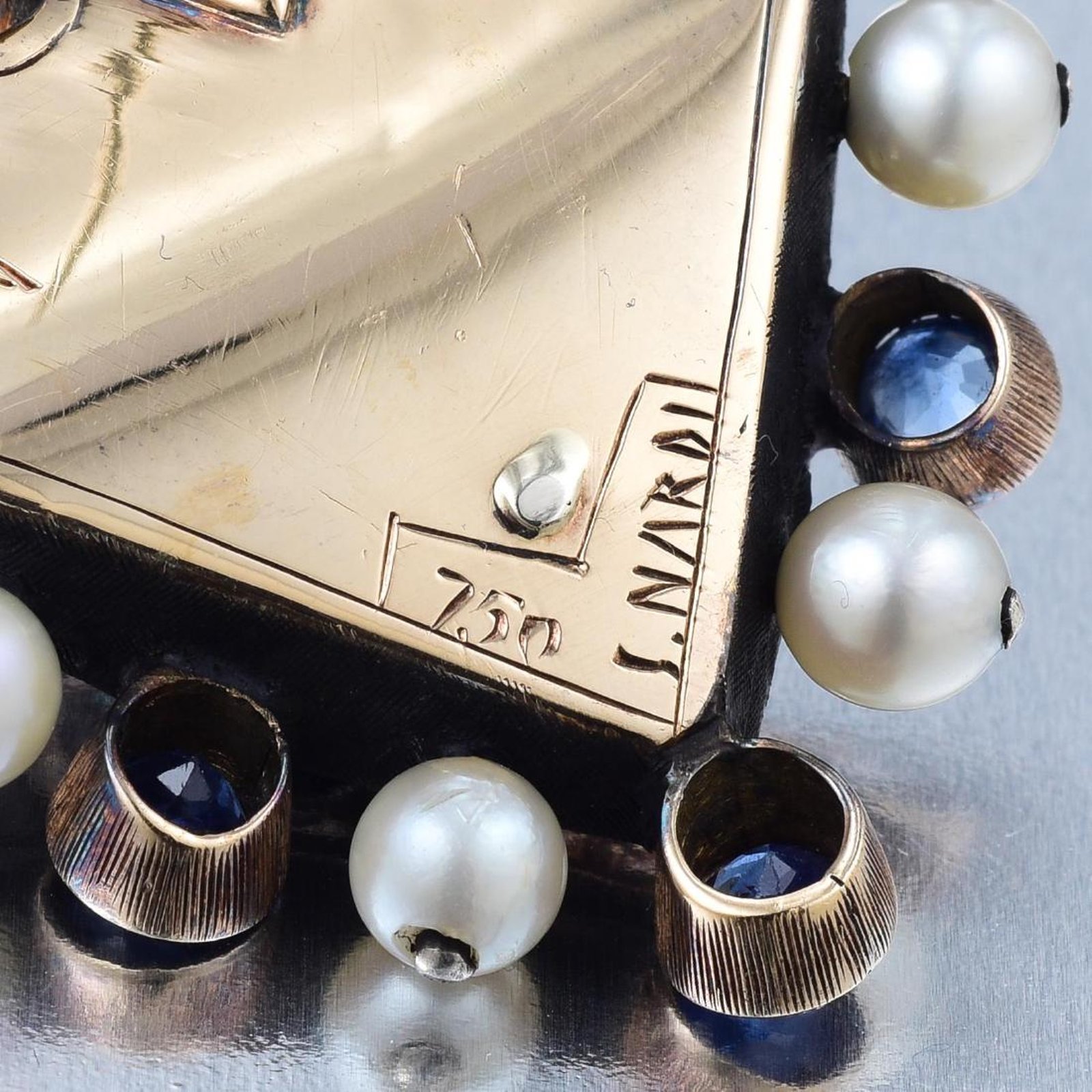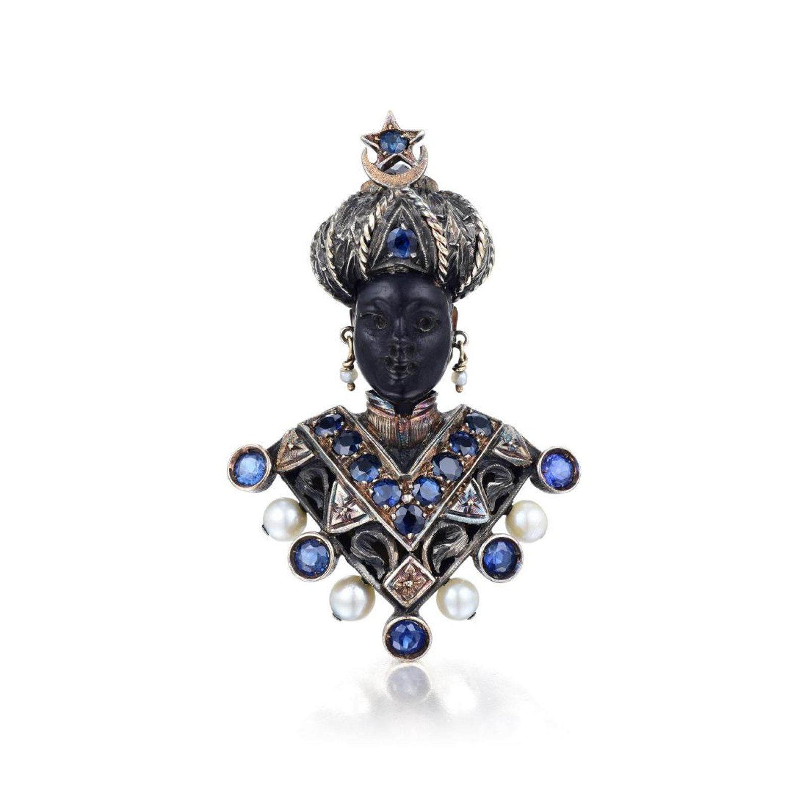 Sapphire and Pearl “Moretto” Blackamoor Brooch. Dressed in its characteristic clothes and turban, the carved ebony Blackamoor, or “Moretto” figure, is hand-crafted out of patinaed 18K yellow gold and silver, with beautiful engraved details, accented with sapphires and pearls, a dark ruby tops the turban, completed with a double pin; measures 2-1/4 x 1-1/2 inches; weight 24.2 g. Signed G. NARDI.; Stamped 750. Sold for $3,000 at Fortuna Auction