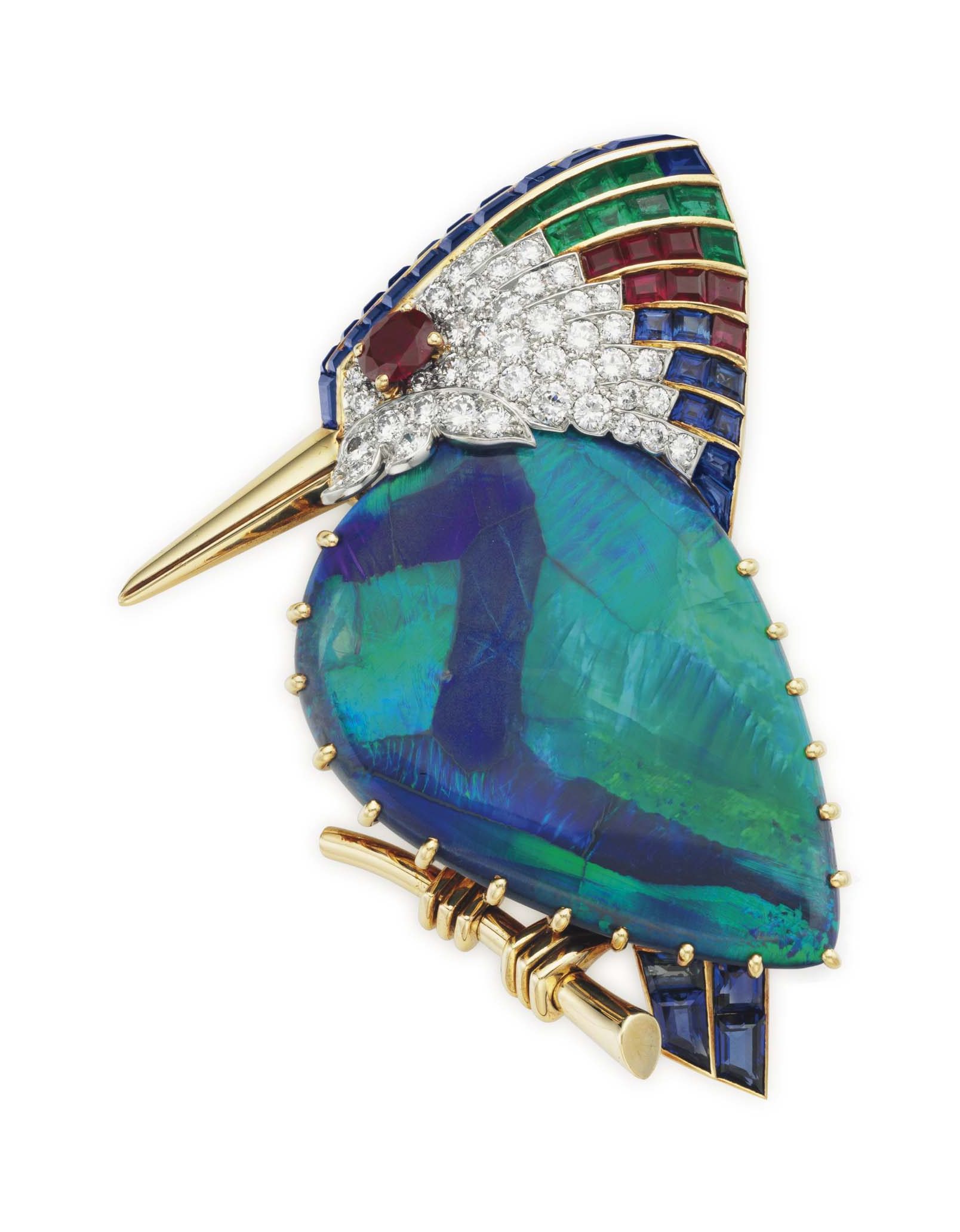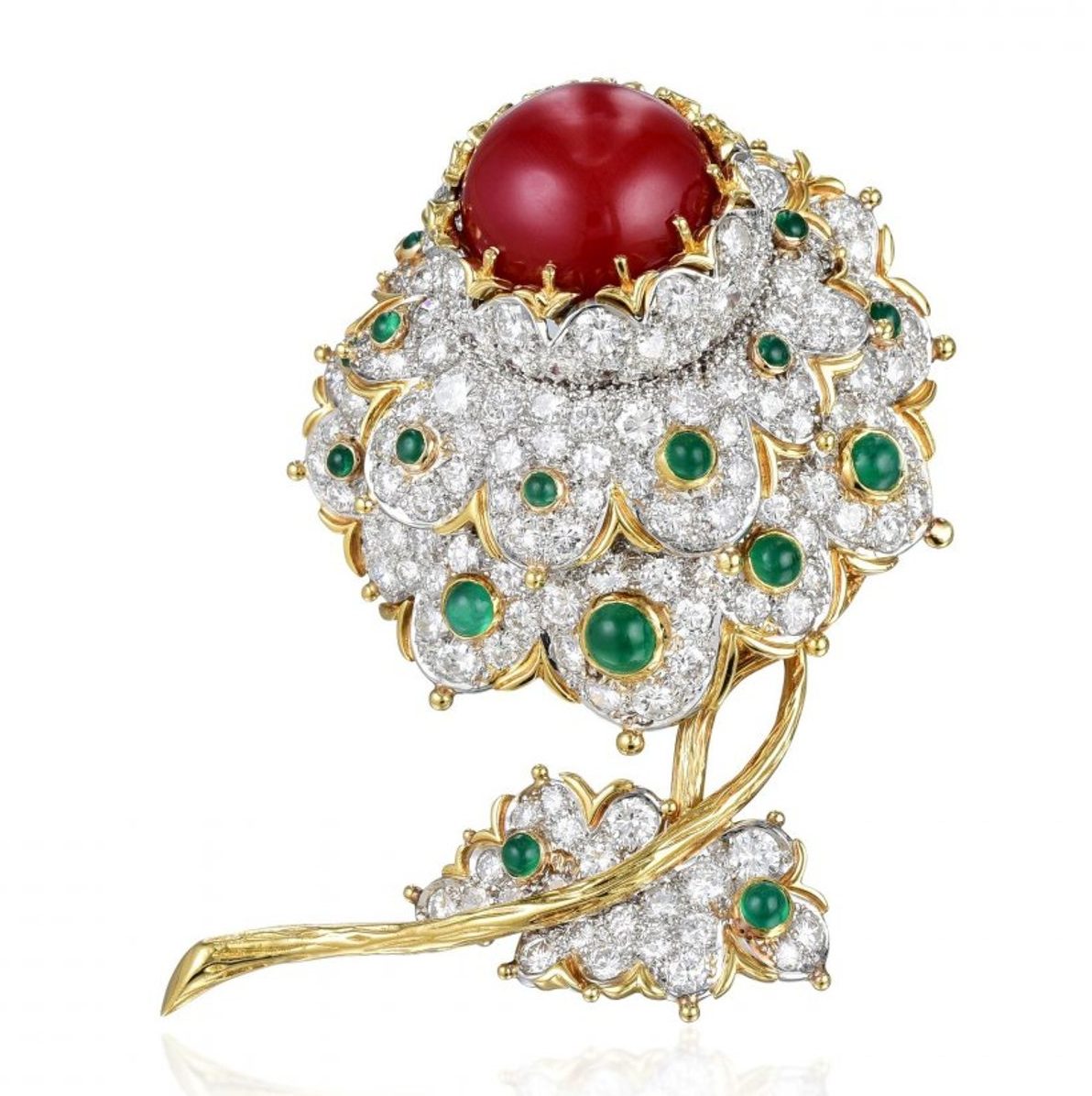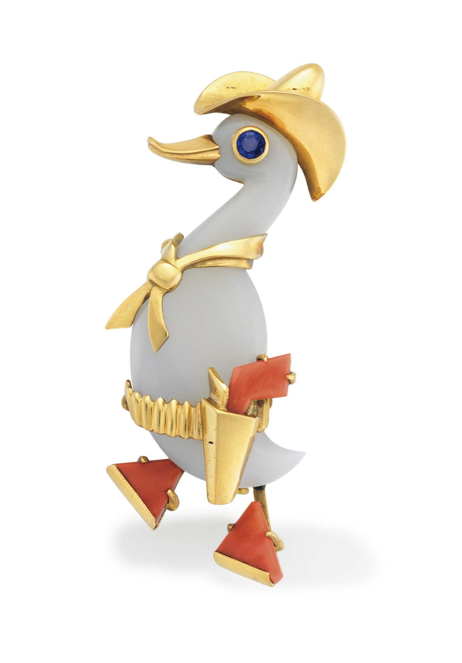 Gem set and diamond pendant brooch, Cartier Cartier Coral, Diamond, and Emerald Flower Brooch A multi-gem 'Cowboy Duck' Brooch by Cartier. 'Panthère' brooch, by Cartier