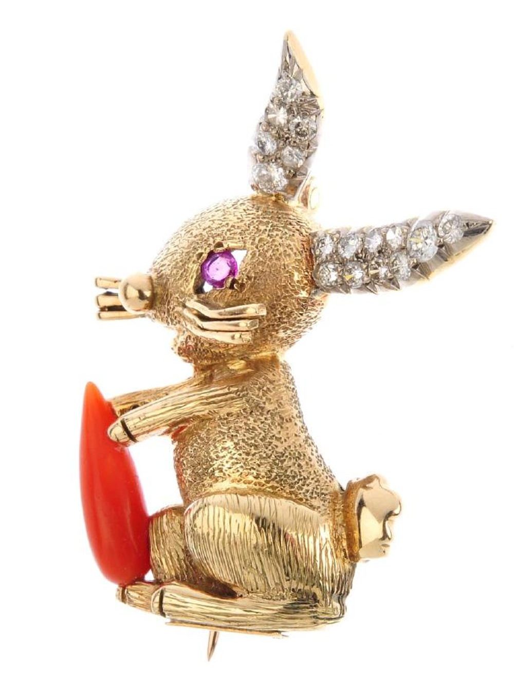 An 18k gold, diamond and ruby double clip brooch, David Webb A GOLD AND RUBY 'ARMADILLO' BROOCH, BY DAVID WEBB Gold, Platinum, White Enamel and Diamond Frog Clip-Brooch, David Webb David Webb Diamond and Ruby Brooch Gold, Enamel, Diamond and Emerald Clip-Brooch, David Webb Designed as a leopard, the spots applied with black enamel and accented with bezel-set round diamonds, the eyes set with cabochon emeralds David Webb Makers Mark